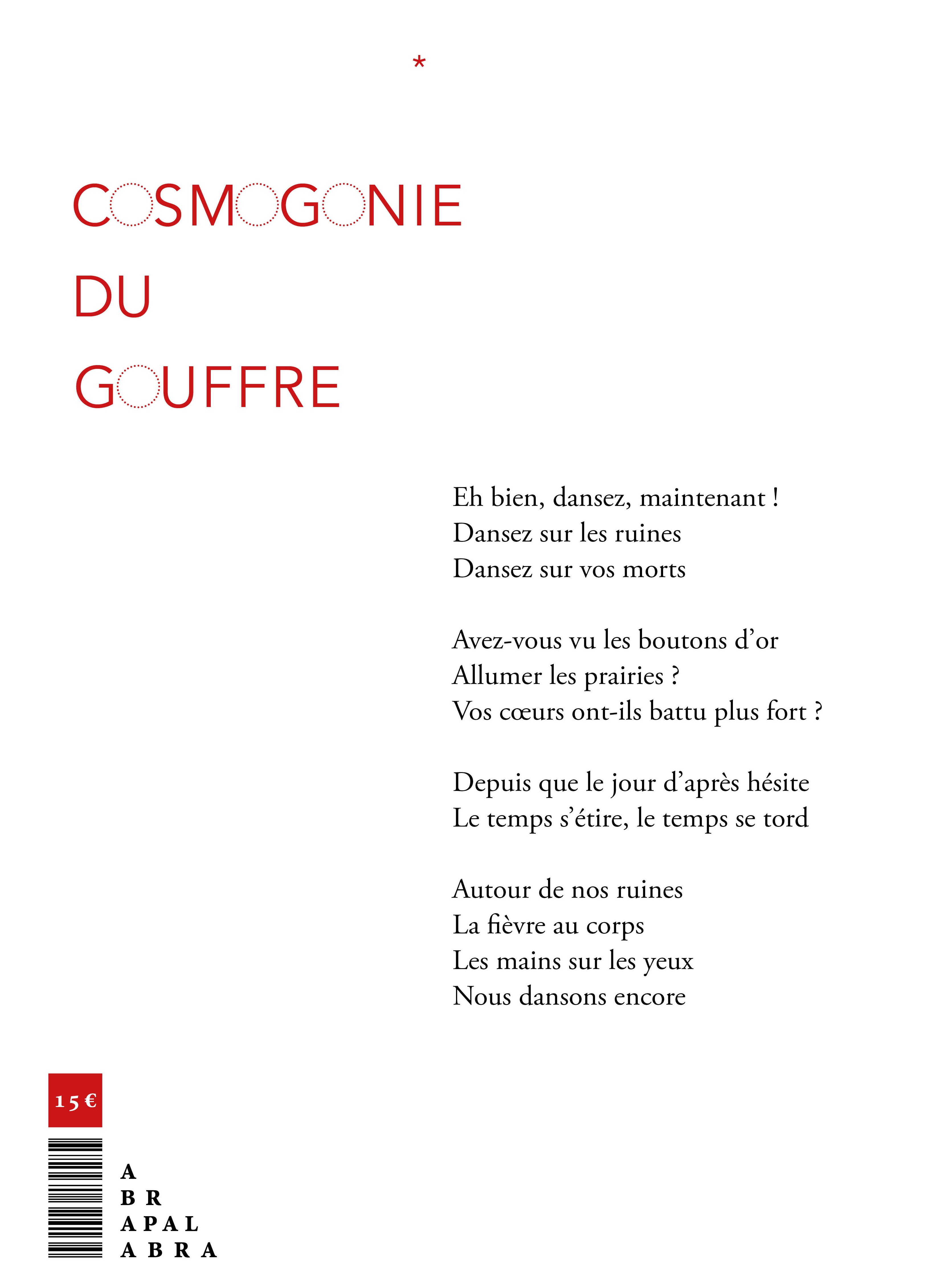 Les cosmogonies des origines sont des mythes tentant d’expliquer les principes à l’œuvre lors de la naissance de l’univers. Depuis, nous n’avons eu de cesse de creuser « la » question : comment est apparu le monde et tout ce qu’il contient ? Se tenir au bord du gouffre est une expérience universelle. Le gouffre est à la fois le risque vacillant de notre premier pas et la beauté tragique du dernier. Il n’est pas une option, rien ni personne n’échappe au point de bascule.