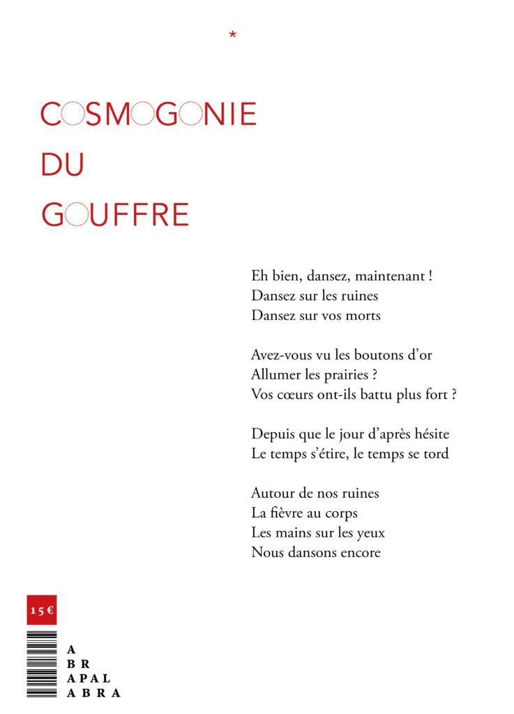 Les cosmogonies des origines sont des mythes tentant d’expliquer les principes à l’œuvre lors de la naissance de l’univers. Depuis, nous n’avons eu de cesse de creuser « la » question : comment est apparu le monde et tout ce qu’il contient ? Se tenir au bord du gouffre est une expérience universelle. Le gouffre est à la fois le risque vacillant de notre premier pas et la beauté tragique du dernier. Il n’est pas une option, rien ni personne n’échappe au point de bascule.